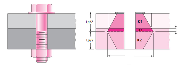Per quanto riguarda gli elementi interposti tra testa e dado invece è possibile stabilire che la rigidezza totale è rappresentabile con molle poste in serie (come per il bullone), la distribuzione del carico è invece più complessa, precisamente a forma di doppio cono (cavo per la presenza del foro per il bullone). L'angolo di inclinazione del cono è considerato di 30°.